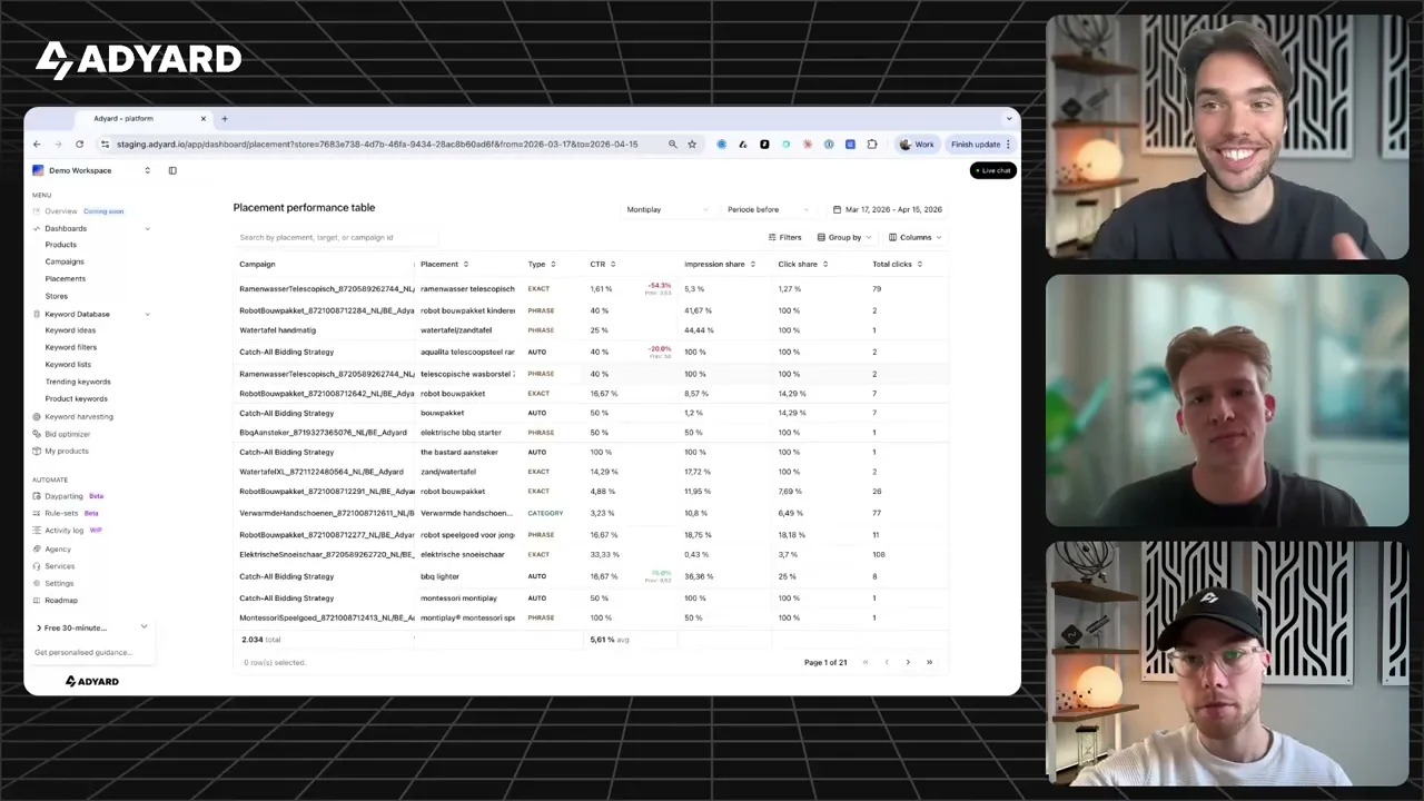 Adyard automatiseert 90–95% van je Bol-advertentiebeheer minder werk, minder verspilling, meer winst. En als je hulp nodig hebt, staan onze specialisten klaar.